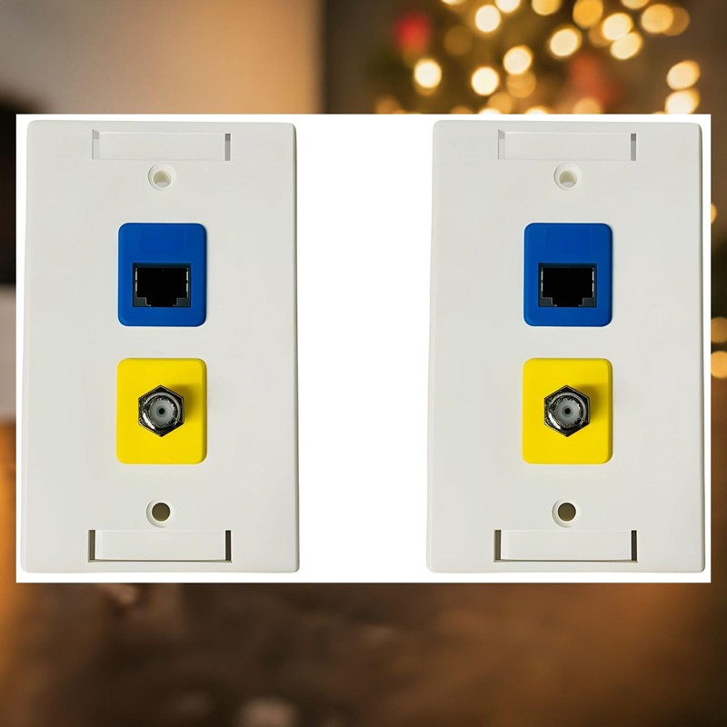Ethernet Cable TV Coax F Type Port Wall Plate (White)-2 Port --Include One Coax Port F Type Connecor (Yellow) and 1 Gold-Plated Cat6A RJ-45 Shielded Keystone Coupler (metal) --Transmission speed up to 10 Gig+ Distance 100 meter+