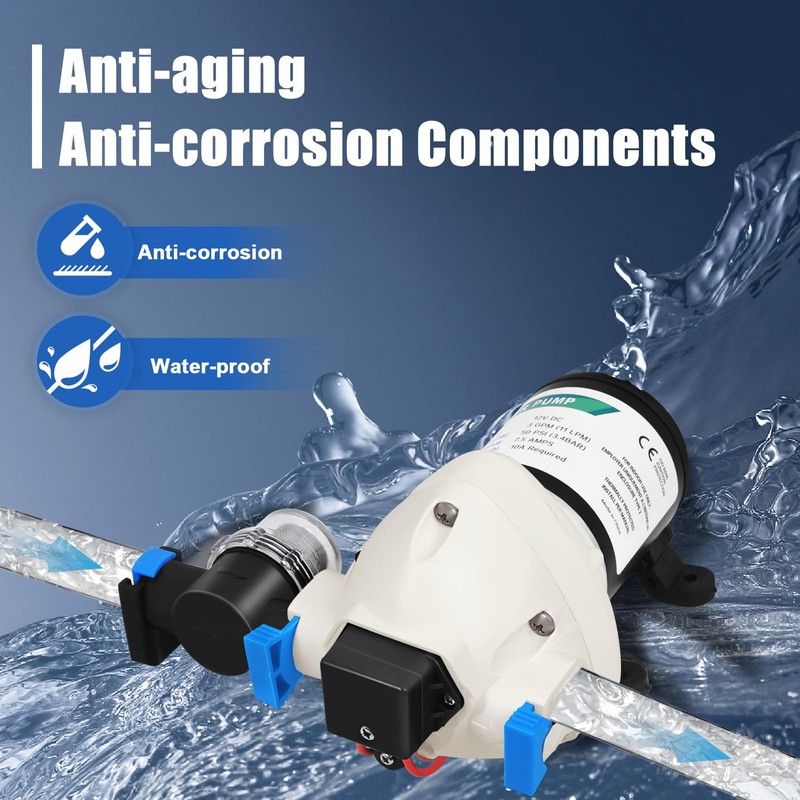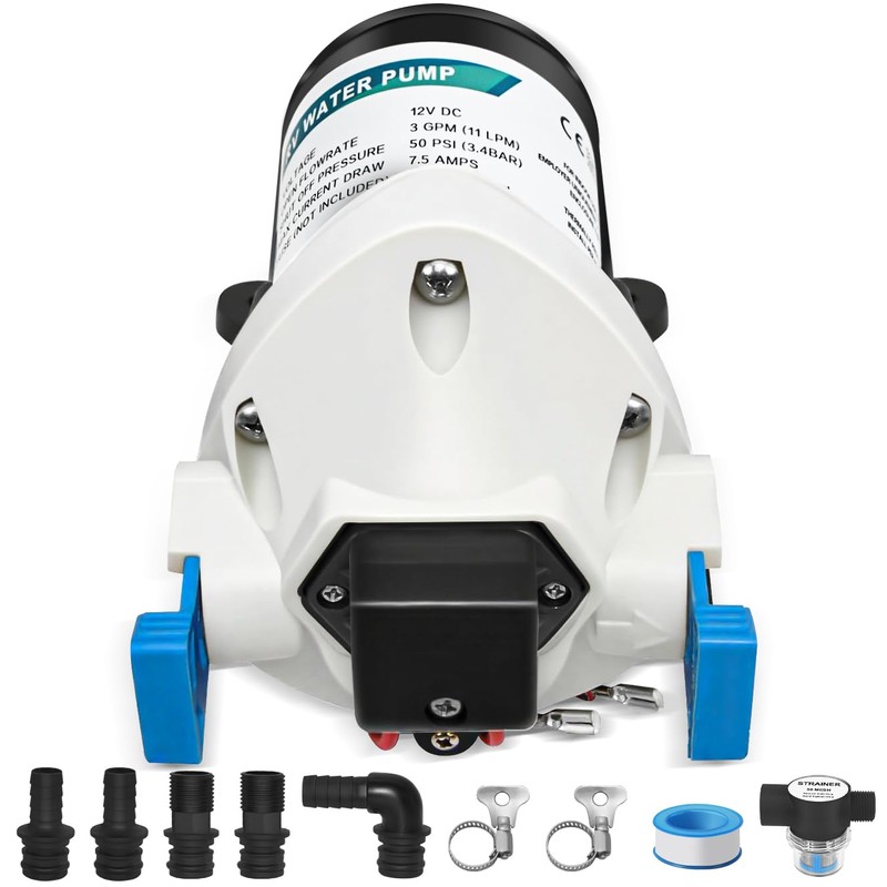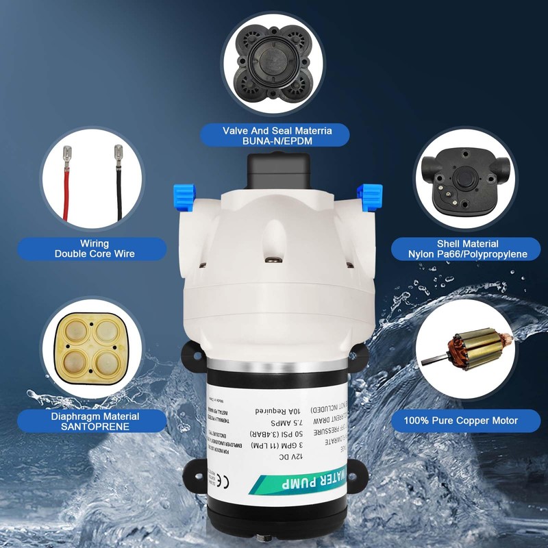 - 【SPECIFICATION】12V DC water pump features 3 GPM water flow. Max Pressure 50PSI (3.4 BAR), 7.5A Max.The RV water pump self-priming up to 9 vertical feet.