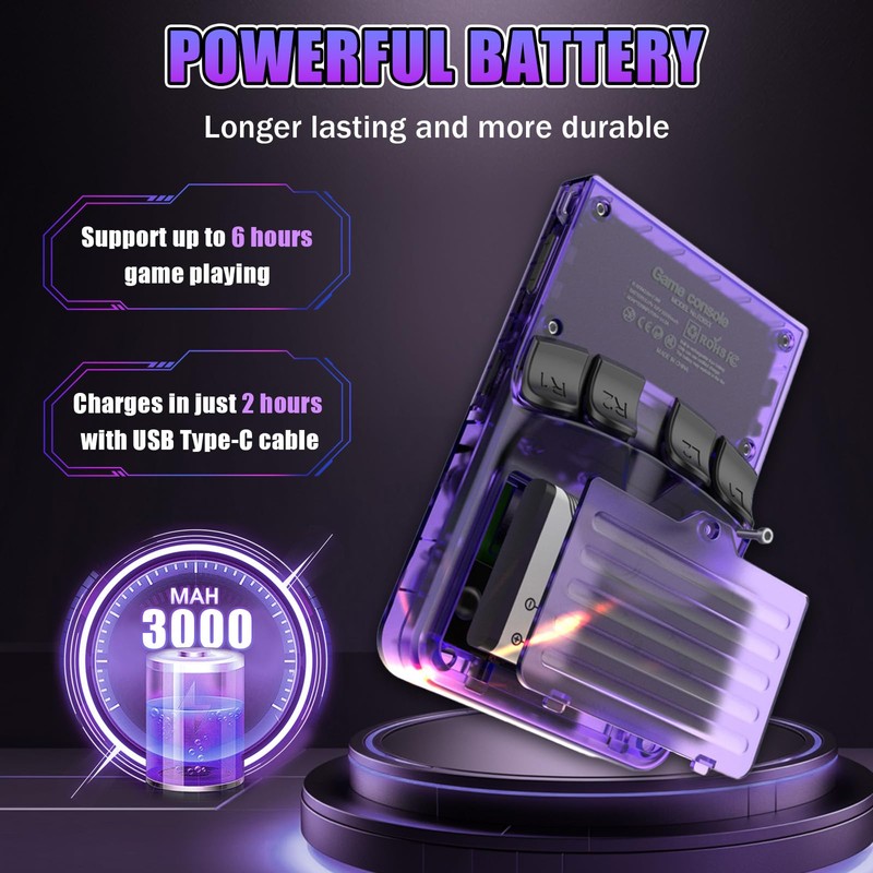 - Long battery life + Immersive sound: This handheld console has a built-in 3000mAh Li-Ion battery that can be charged for up to 8 hours of gaming with just a 2-hour charge from the Type-C connector, and the R36XX also has built-in 8W chambered speakers that provide high-quality sound that is immersive and enhances your retro gaming console experience