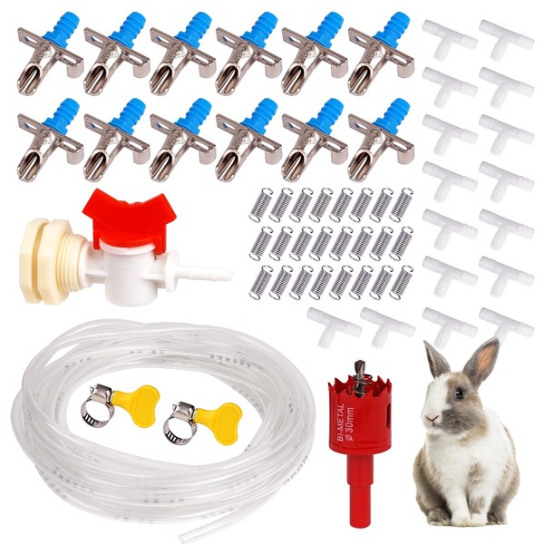 - NOTE: If the tube is twisted when you receive the item, you can soak it in warm water for a while. PACKAGE LIST: 12 sets rabbit nipple drinkers(including 12pcs nipple drinker,12pcs “T” tee and 12pcs spring) + 23ft hose + 1 piece water bucket connector + 1 piece 30mm hole opener + 2pcs hose clamps