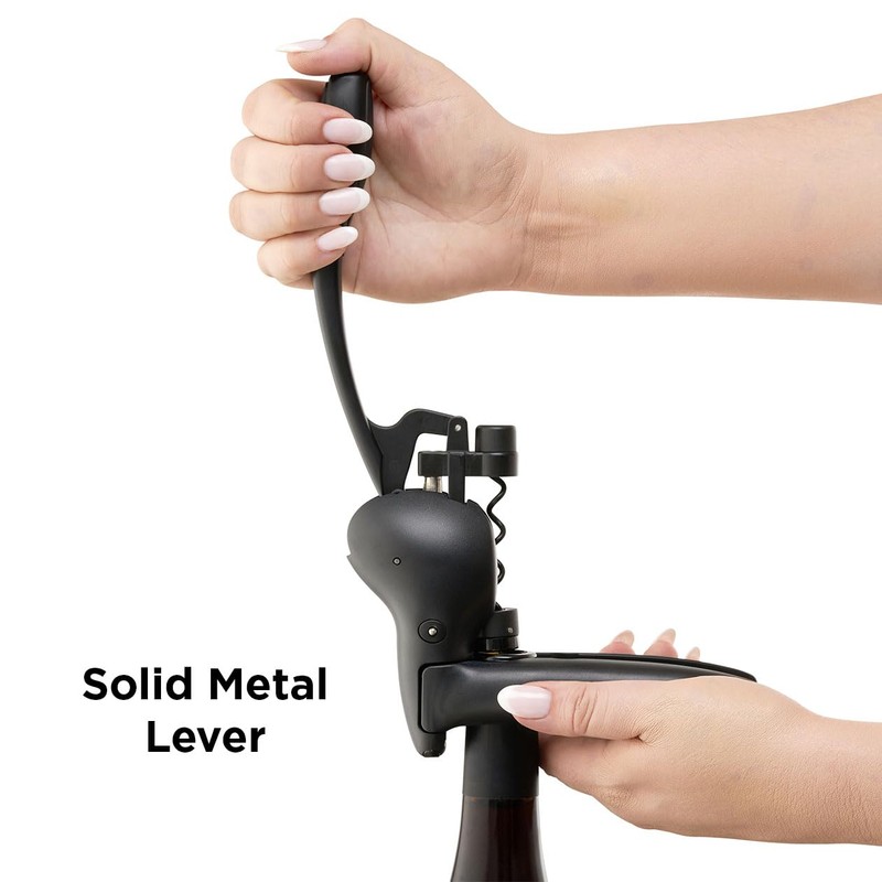 - EASY-TO-USE CORKSCREW: Grip handles around bottle neck and use lever to insert spiral and remove the cork from the bottle in a matter of seconds. Great for all levels of wine drinkers from novice to connoisseur.
