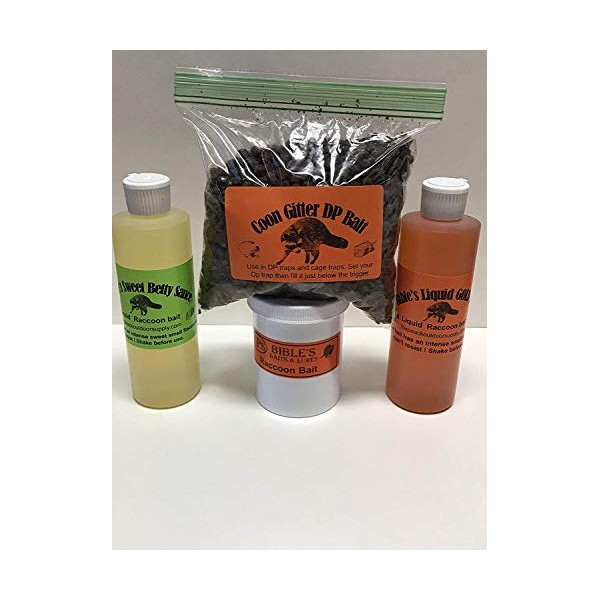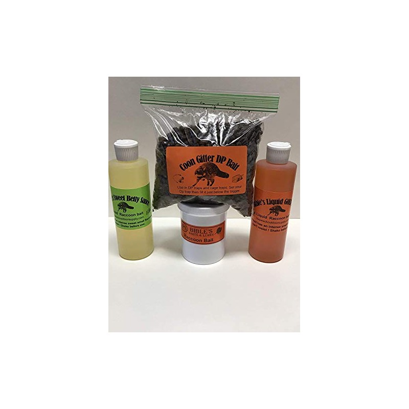 • Variety of Baits for Raccoon trapping Convenient and economical 8 oz. Raccoon Bait 12 oz. Coon Gitter Bait 8 oz. Bible's Liquid GOLD Bait 8 oz. Bible's sweet Betty Sauce