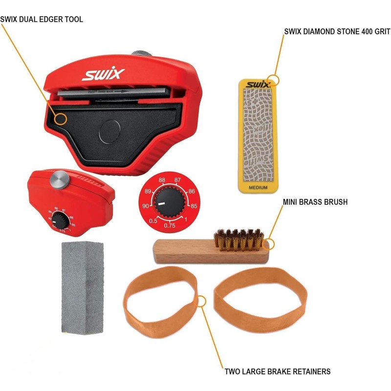 * Dial a precise side angle from 0 degree to 5 degrees and 0.5 to 1.0 degree on the base. Nine angles total. * High quality Swiss-made ICECUT included (80 mm). * NOTE: 80 mm is the maximum length file or stone that will fit into this tool. 70- or 80-mm stones are recommended. * One Swix gray Gumi or Gummi Stone for prepping an edge, deburring as the final step in edge sharpening, or detuning. * Swix 80-mm Diamond Stone included: Yellow Medium TA400SE= for routine edge maintenance and sharpening (400 grit) * It is recommended that you set the edge bevels with the file and then replace the file with 70- or 80-mm diamond stones to maintain the sharpness; if you always use the metal file, you will wear away the edge. * Bonus Benefit for this tool: If you don't know what base and side angles your ski/board are set to, this tool can help you find them. Before you start mark the metal edge with a sharpie, start the tool at the lowest angle and see if it removes the marking on your edge. Raise the angle step-wise and repeat until it removes the mark. That is your angle! Record the base/side angles for future reference. * File cleaning brush for removing metal filings from grooves. Measures 3.25 x 0.6 x 0.4 inches. * Ski brake retainers: two large (color may vary) ski shop quality bands. * Detailed instruction card with links to video help.