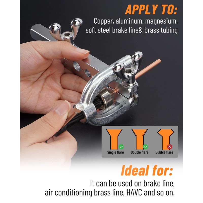 - MAKE DOUBLE & SINGLE FLARES: Designed to use when flaring single or double flare in a variety of material: copper, aluminum, brass, magnesium, and soft steel brake line tubing. Flaring tool apply to 1/2", 3/8", 5/16", 1/4", 3/16" O.D. tubing.