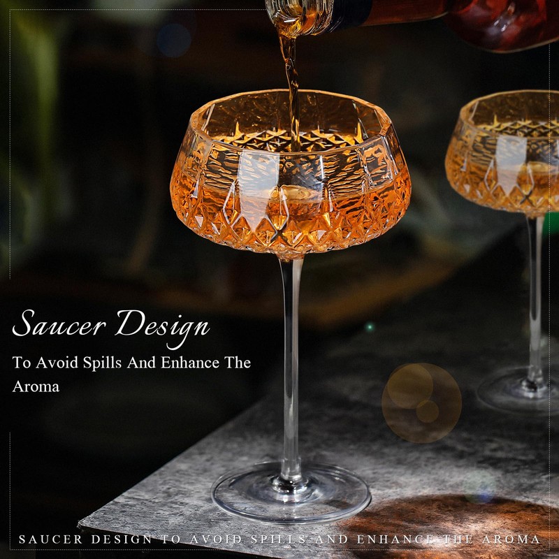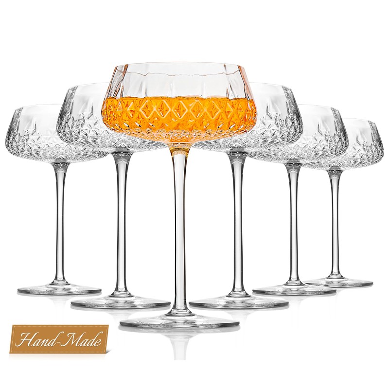- 【Elegant Diamond Design】 The RACOBOT coupe glasses set of 6 feature a stunning diamond-pattern design that’s as beautiful and elegant as a gemstone. With smooth edges and a sleek silhouette, coupe cocktail glasses bring a touch of sophistication to any occasion. Suit for elevating your cocktail presentation, martini glasses set of 6 offer a luxurious vibe to your home bar. Whether you're enjoying drinks with friends or setting the table for a special evening, these elegant diamond-cut design is sure to impress guests!
