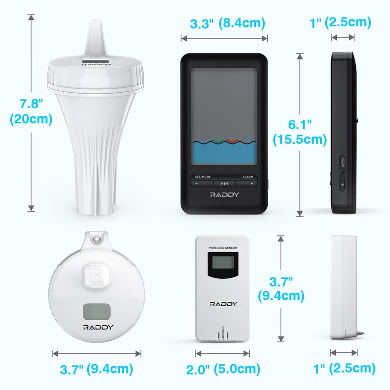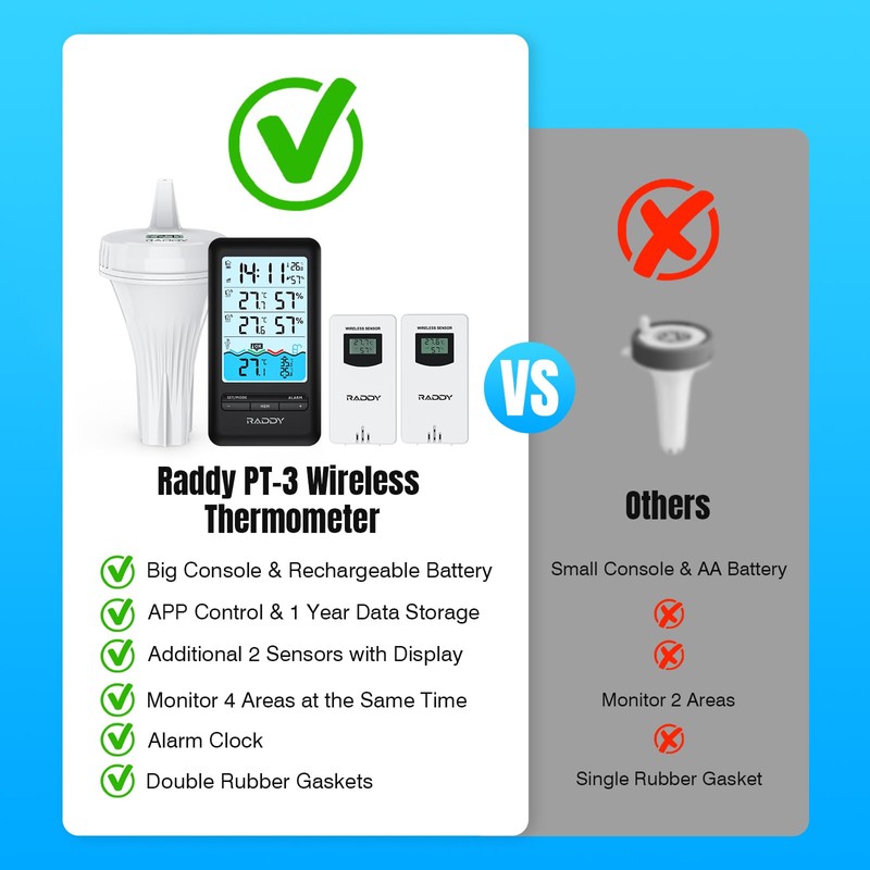 Raddy PT-3 Smart Pool Thermometer with 2 Additional Remote Sensors,Digital Swimming Pool APP Remote Monitor with IPX7 Waterproof, Remote App Notification Alert for Ice Bath Tub, Fishbowl, Pond,Hot Tub
