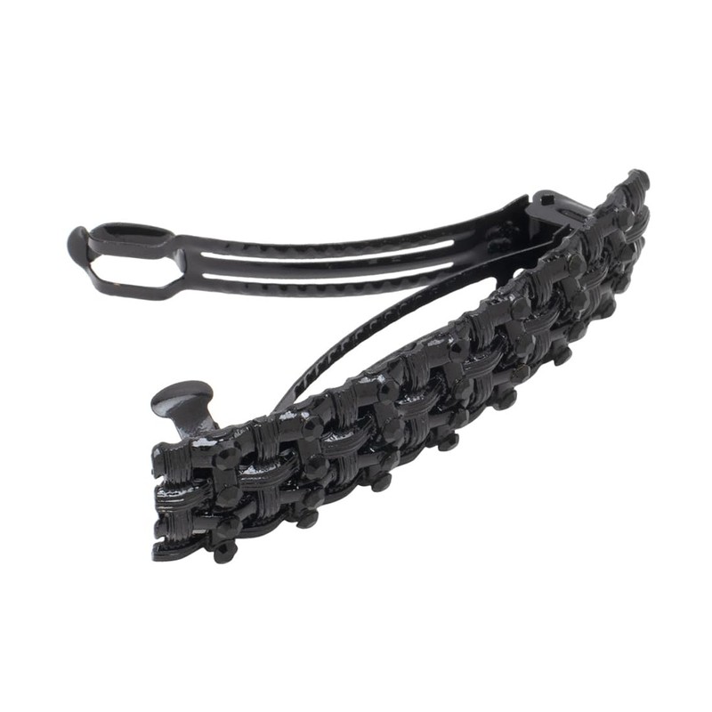 - Elegant Design: Matte black metal barrette with a woven pattern and black crystal accents, perfect for adding a sophisticated and stylish touch to any hairstyle.