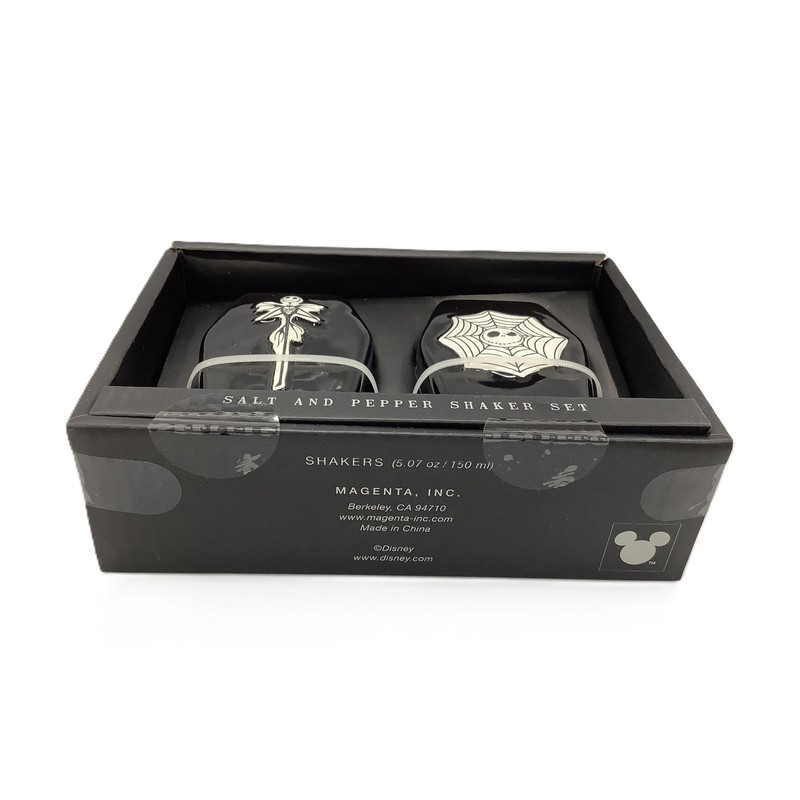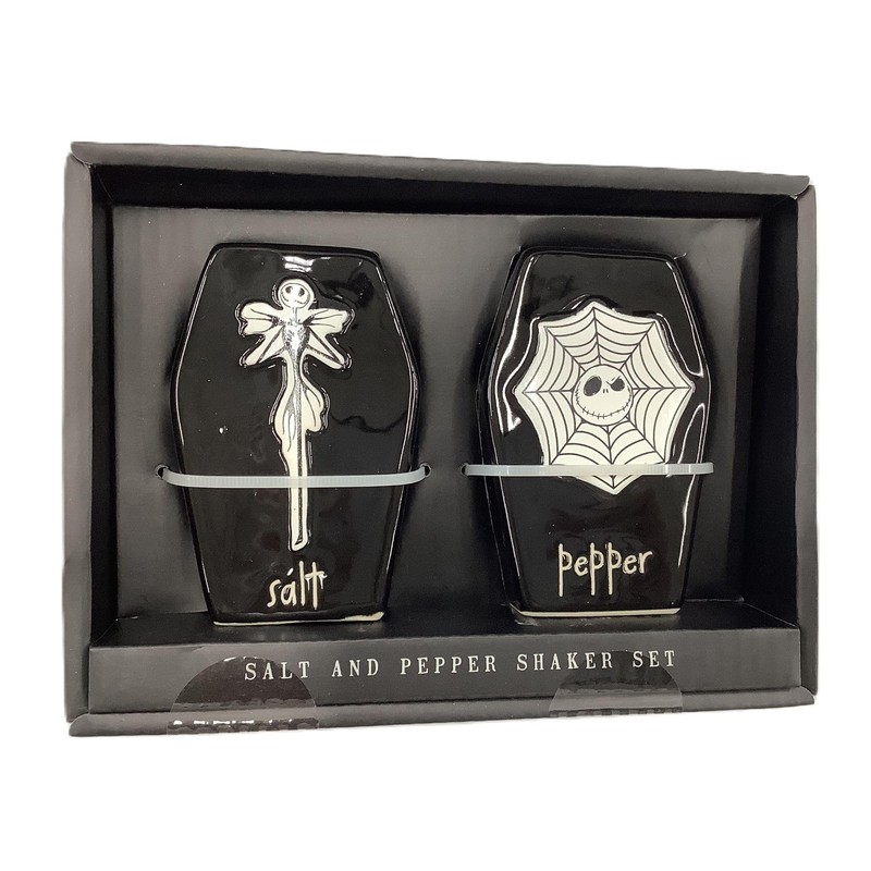 - DESIGN: Gothic-inspired coffin-shaped ceramic salt and pepper shakers featuring spooky Halloween designs in black and white colors