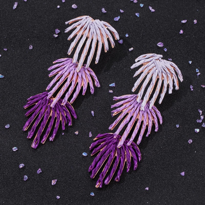 Raffia Palm Leaf Drop Dangle Earring- Handmade Boho Statement Earrings for Summer (Purple)