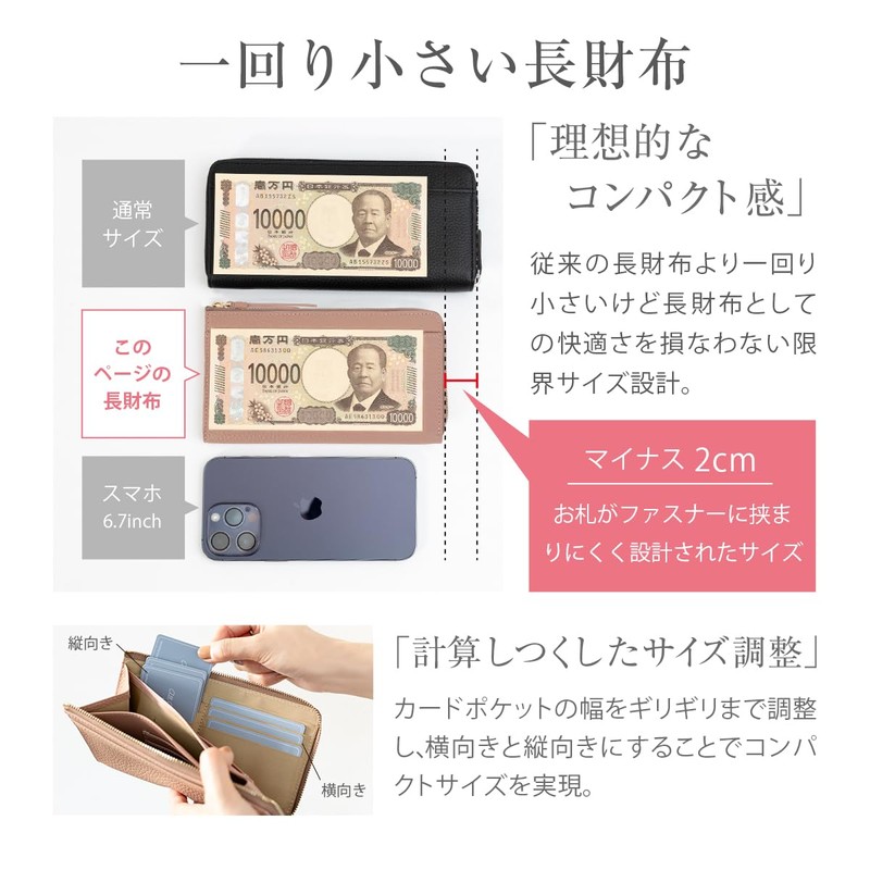 - Long Wallet + Compact: This wallet is a "good and kid" wallet that has been sized to the limits while maintaining the comfort of a long wallet. It is small enough to fit into a small bag, yet has 16 card pockets + 4 free pockets. Bills can also be stored without folding