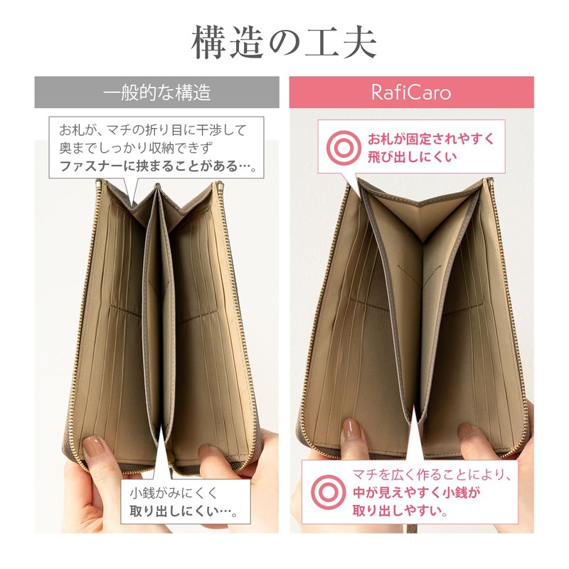 - (Materials) The outer shell is made of shrunken leather with an elegant and gentle texture. The zipper is made of YKK material. The coin purse is easy to access with its unique gusset construction. You can access your bills, coins, and cards with one action, making your checkout smooth