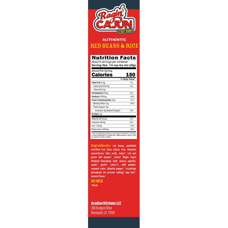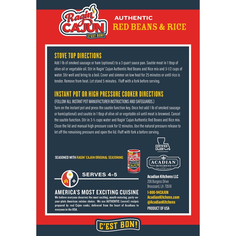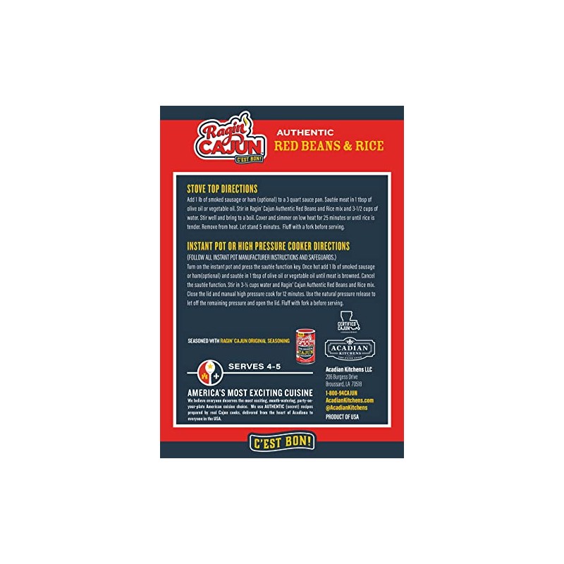 INNOVATIVE, DELICIOUS & NEW AUTHENTIC & EASY RED BEANS & RICE: ready in just 25 minutes, serves 4 – 5 SEASONED WITH RAGIN’ CAJUN ORIGINAL SEASONING STOVE TOP DIRECTIONS Add 1 lb of smoked sausage or ham (optional) to a 3 quart sauce pan. Sautée meat in 1 tb sp of olive oil or vegetable oil. Stir in Ragin’ Cajun Authentic Red Beans and Rice mix and 3-1/2 cups of water. Stir well and bring to a boil. Cover and simmer on lo w heat for 25 minutes or until rice is tender. Remove from heat. Let stand 5 minutes. Fluff with a fork before serving. INSTANT POT OR HIGH PRESSURE COOKER DIRECTIONS (FOLLOW ALL INSTANT POT MANUFACTURER INSTRUCTIONS AND SAFEGUARDS.) Turn on the instant pot and press the sautée function key. Once hot add 1 lb of smoked sausage or ham(optional) and sautée in 1 tbsp of olive oil or vegetable oil until meat is browned. Cancel the sautée function. Stir in 3-½ cups water and Ragin’ Cajun Authentic Red Beans and Rice mix. Close the lid and manual high pressure cook for 12 minutes. Use the natural pressure release to let off the remaining pressure and open the lid. Fluff with fork a before serving. Ingredient statement: Red beans, parboiled enriched rice (rice, niacin, iron, thiamine mononitrate, folic acid), onion*, red and green bell pepper*, celery* Ragin’ Cajun Original Seasoning (salt, spices, paprika, onion*garlic* celery*), chili powder, caramel color, chipotle pepper*, tricalcium phosphate (anticaking agent), bay leaf*, natural flavor *dried NO MSG