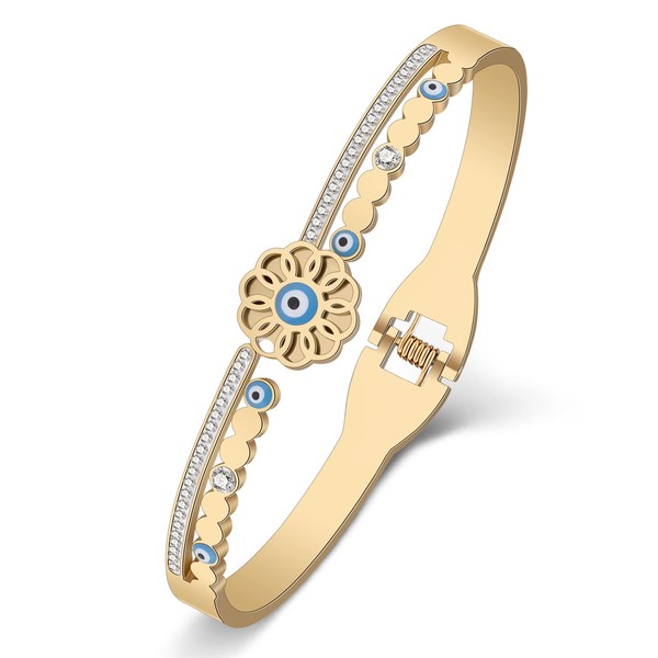 RAIDIN Stainless Steel 18K Gold Silver Plated Cute Evil Eye Bangle Bracelet for Women Lucky Evil Eyes Bracelets Protection Crystal Jewelry for Birthday Party Gift Charms (Gold-062)