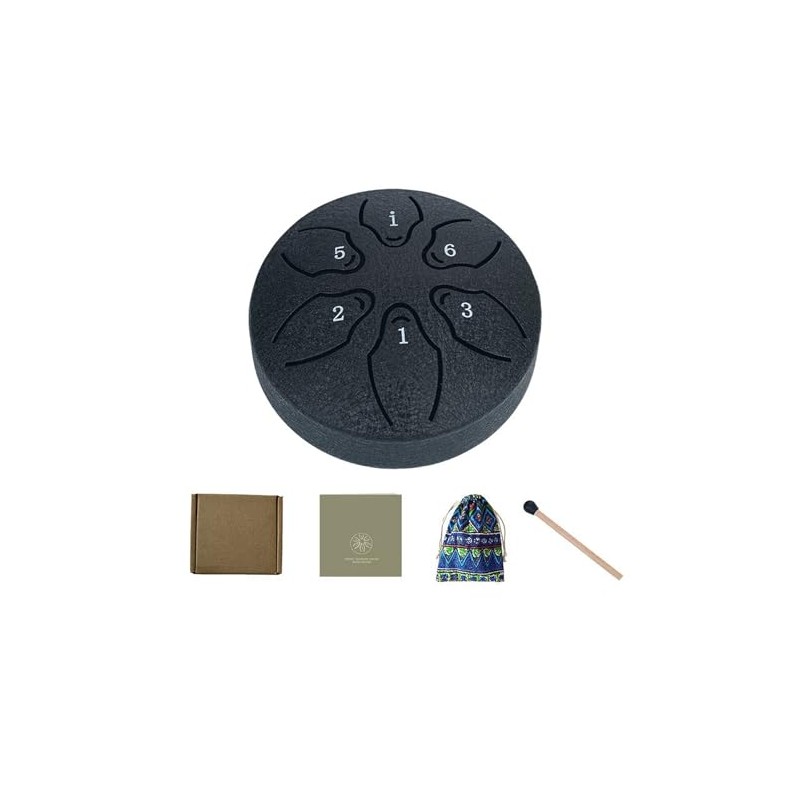 • Package Include & Size:The package come with 1pc 6 notes steel drum, size about 3.2 inches. 1pc mallet ,the mallet produce a higher fundamental volume and noticeable harmonies. 1pc bag, easy to carry for traveling or camping