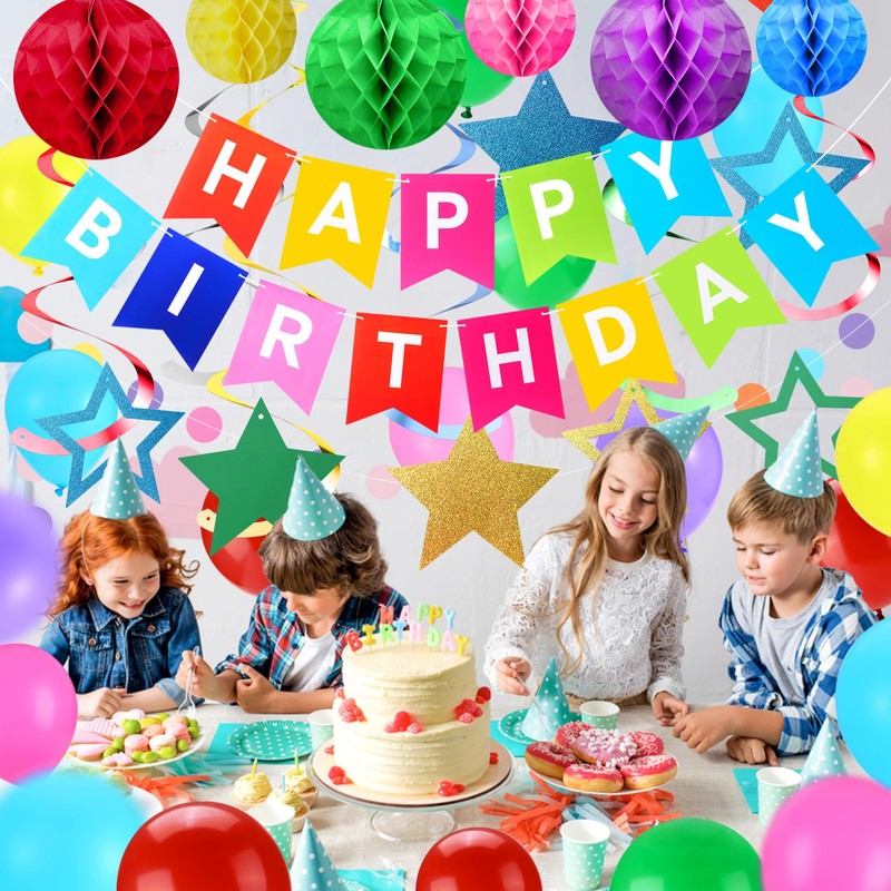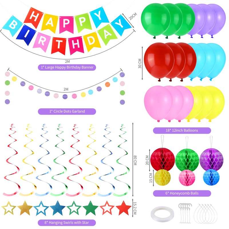 - 【Great Value Pack】The birthday decorations kit Includes everything you need. 1 x HAPPY BIRTHDAY Banner, 6 x Honeycomb Balls, 8 x Hanging Swirl with Stars, 1 x Circle Dots Garland, 16 x Balloons. Creating a magical and enchanting atmosphere for your birthday party.