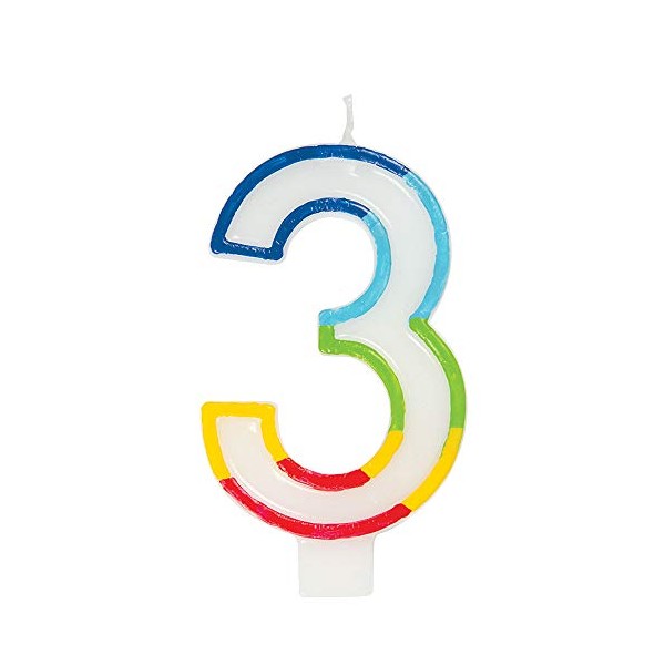 • UNIQUE DESIGN: Have a quick and classic way to decorate a cake with this candle that features a white number 3- shaped design adorned with a rainbow-colored border.