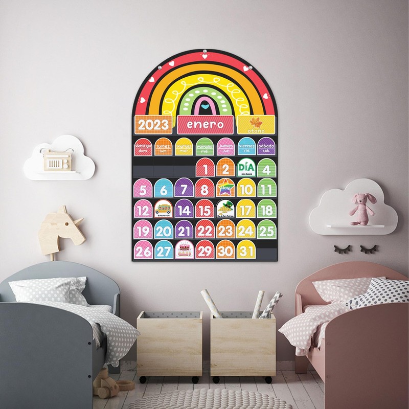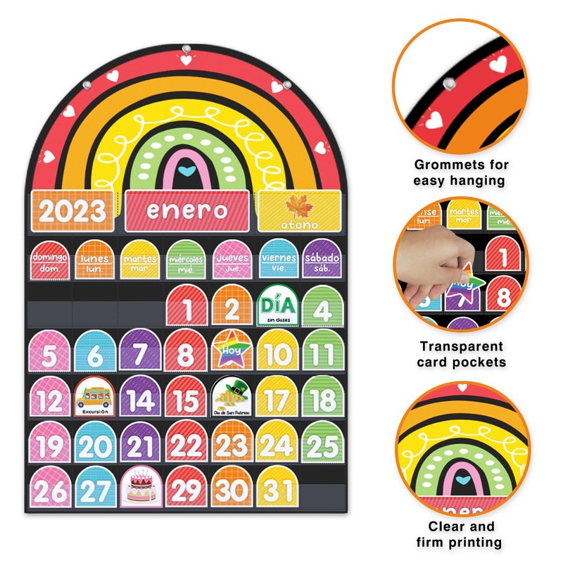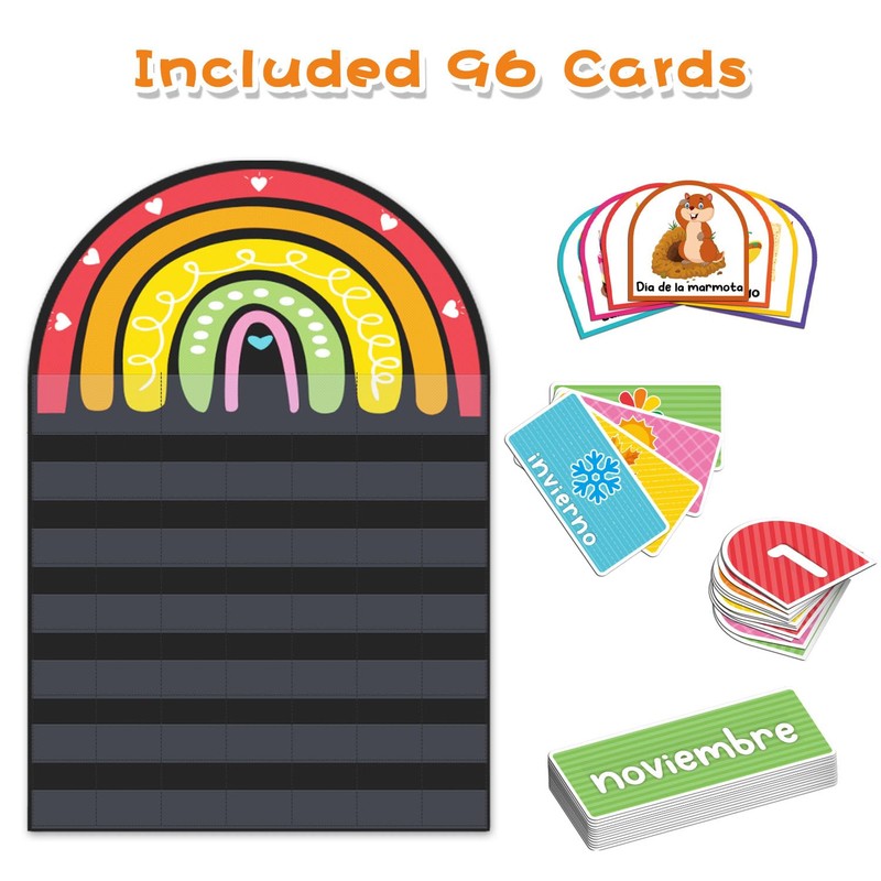 Rainbow Design Calendar Pocket Chart for Classroom & Home with 96 Activity Cards -Educational and Learning Calender Skills (Spanish)