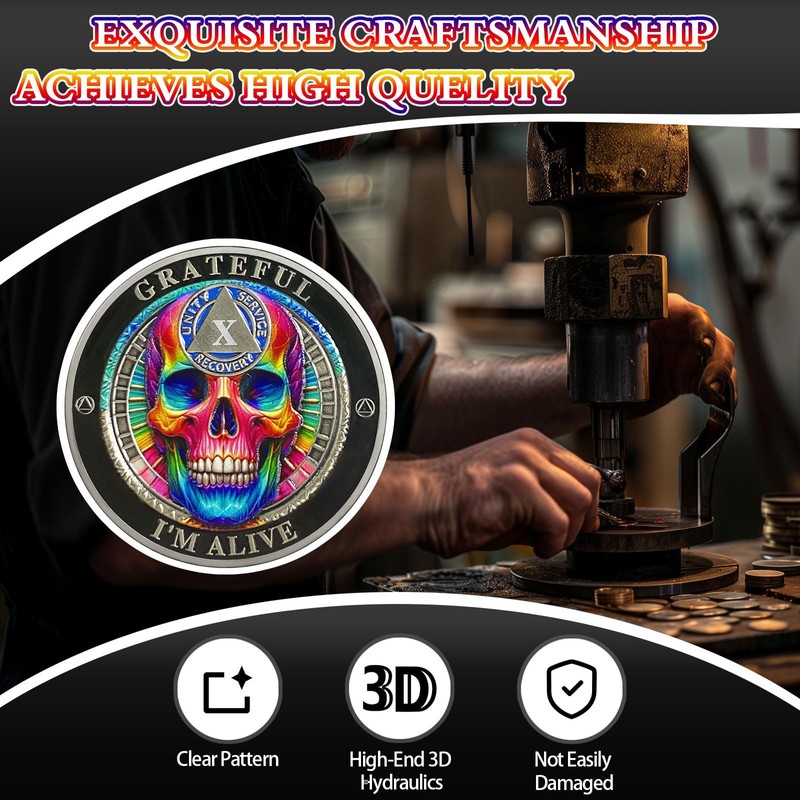 - Rainbow Skull: The obverse of this sobriety coin features a brightly coloured and impactful skull. The Roman numeral ‘Ⅹ’ on the AA coin represents the ten-years sobriety milestone that has been achieved. The skull designed by this sober coin symbolises the struggles and darkness of the past, while its colourful colours symbolise rebirth and hope. The words ‘I'm glad I'm alive’ reflect the gratitude and appreciation of life. This sobriety gift is unique and memorable