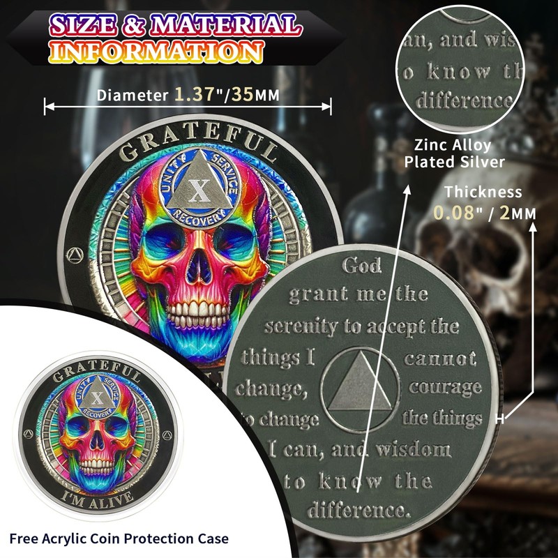 Rainbow Skull 10 Year Sobriety Coin Grateful I'm Alive Ten Years Sober Chip - AA Chips and Medallion - AA Coin with Serenity Prayer Sobriety Gifts for Men Women
