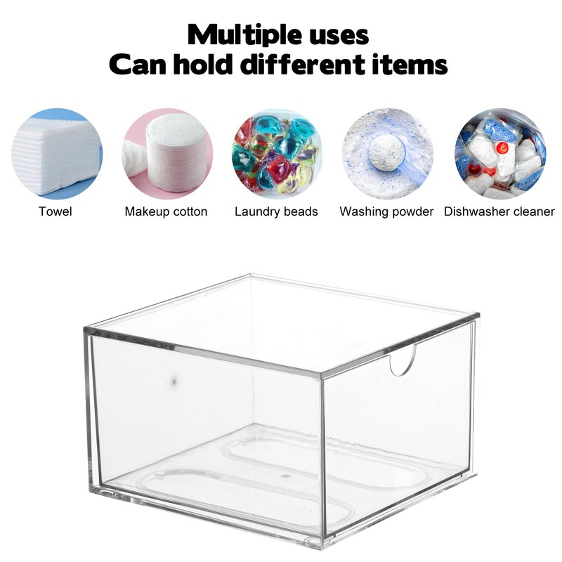 Rainmae Disposable Face Towel Holder, Face Towel Storage Box Bin, Stackable Clear Makeup Organizer with Drawer for Clean Skin Club Face XL Towels Holder for Vanity Bathroom and Makeup OrganizationProduct Description:The specially designed grooves on the bottom of the dryer sheet holder enhance its stability, ensuring it stays put even in damp bathroom settings, preventing any slips.With its lightweight material, you can move easily, this laundry pods box is your go-to helper for home organization! It's the perfect addition to any countertop, providing a sleek and functional storage solution.Specification:Material: PETColor: clearSize: 6"x6.5"x3.9" (15.3x16.5x10cm)Weight: 15.34oz (435g)Package includes: 1 disposable face towel holderNotes:Manual measurement, please allow slight errors on size.The color may exist a slight difference due to different screen displays.