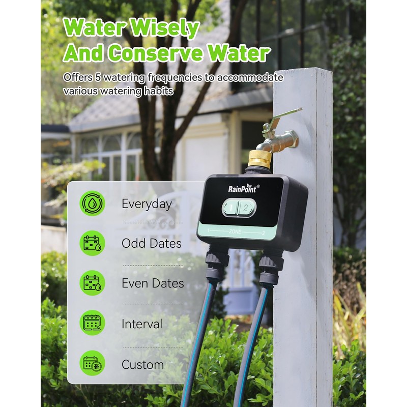 • 【Dual Programmable Zones】 Each smart hose timer zone operates independently, allowing for customized watering schedules for each zone. Set up to 6 watering schedules per zone for efficient and intelligent watering.