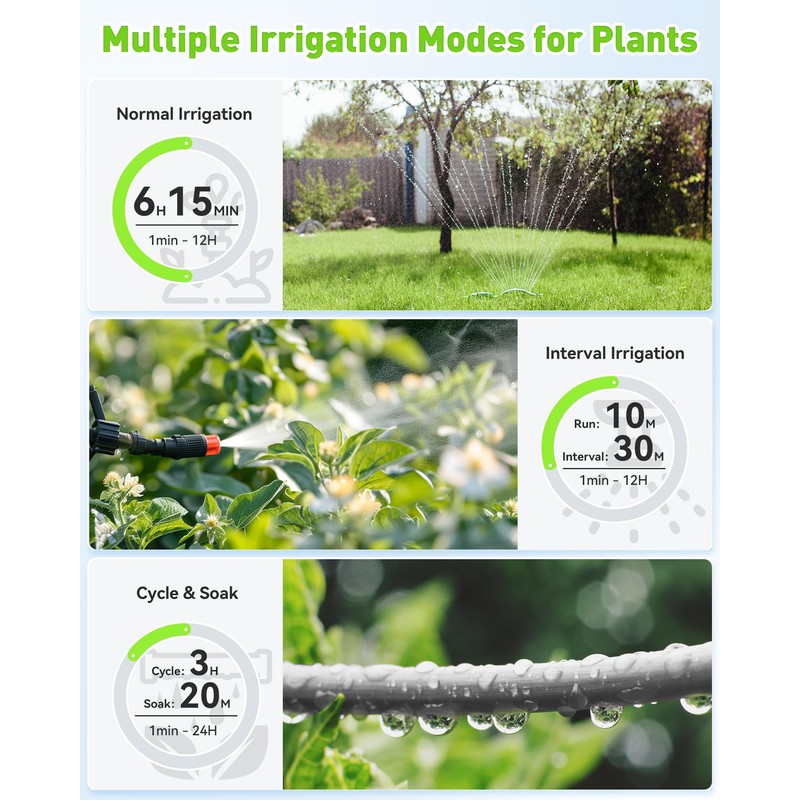 • 【Flexible Irrigation】 The WiFi water timer offers 3 watering modes: Normal irrigation (1 min-12 hours), Interval irrigation (1 sec-60 mins), and Cycle & Soak (1 min-12 hours). Choose from 5 watering frequencies—daily, weekly, odd days, even days, or every 2 to 30 days—to meet all your watering needs.