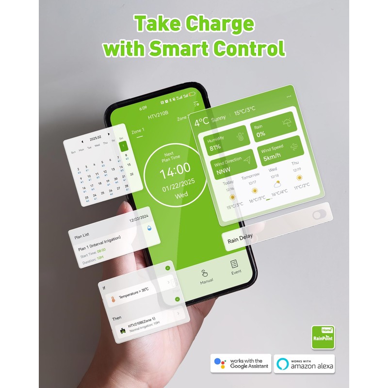 • 【Irrigation Made Smarter】 Use Smart Scenes to both automatically adjust your watering schedule based on weather conditions and to enable linkage between multiple RainPoint devices, making your garden system smarter.