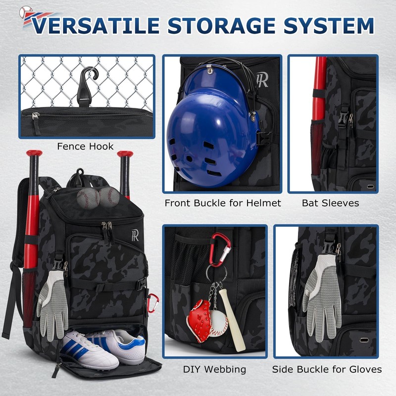 - SMART STORAGE: Our baseball bag adult keeps everything secure and within reach: Front Helmet Fixation– securely fastens helmet during transport avoidding rolling. Side Glove Straps–for grab-and-go convenience during gameplay. Elevated Top Hook–keeps your bag clean and off muddy surfaces, perfect for sidelines. Dual side water bottle pockets keep drinks handy, while external webbing loops add extra storage for carabiners, towels, or training tools. Never fumble with your gear again