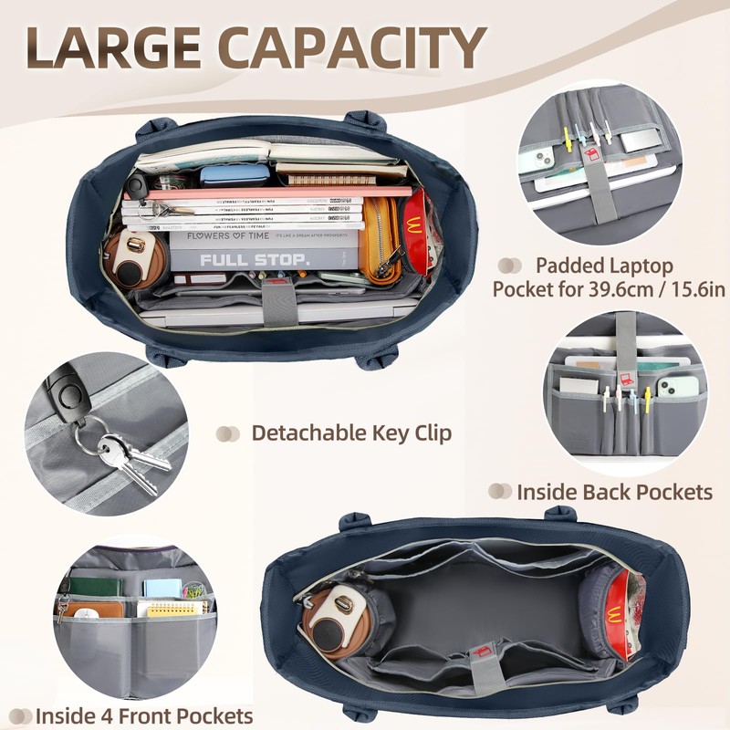 - 💼Bag Structure:Inside laptop tote bag there is a large compartment with a padded laptop pocket fits up to a 15.6 inch laptop,a tablet pocket,six pockets,four slots,two insulated pockets and 1detachable key clip.Outer seven pockets in total include four pockets in the front (one large zipper pocket,one small zipper pocket and two open pockets) two mesh side pockets, an anti thief pocket on the back.