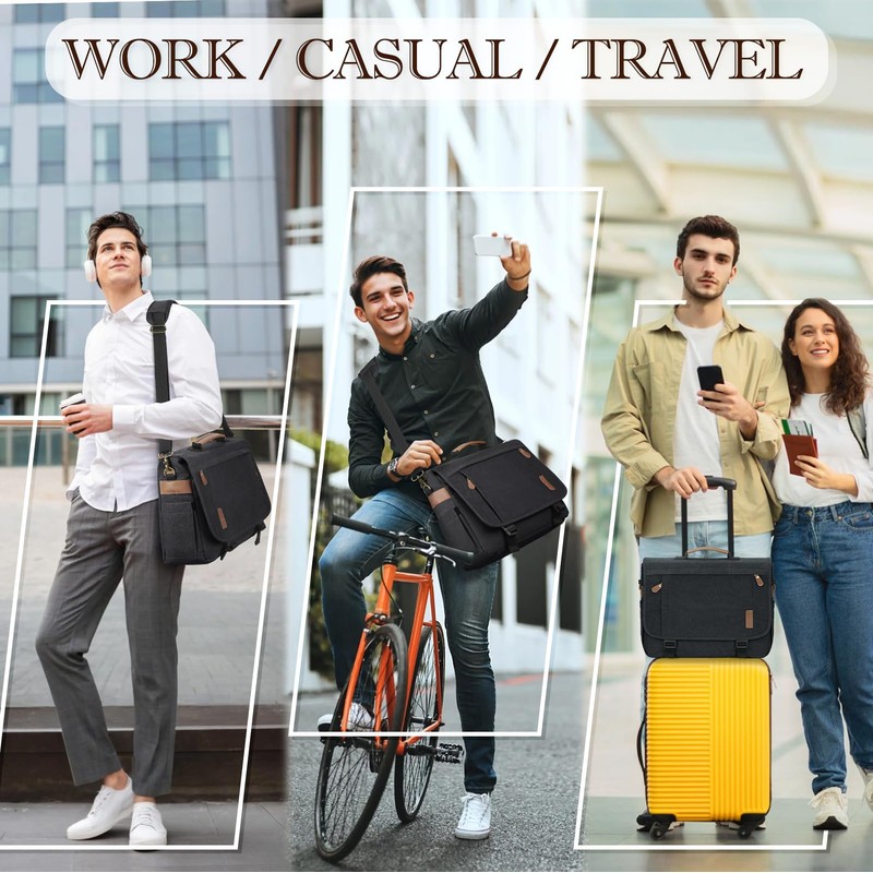- Convenient Buckle & Padded Laptop Sleeve: The laptop messenger bag is double-fastened by buckles and zippers. The buckles of this laptop bag is adjustable. It is easy to close the buckes even you have a large volume of items in the bag. The padded laptop sleeve fits most laptops up to 17 inches, and the sticky seal ensures it stays stable.