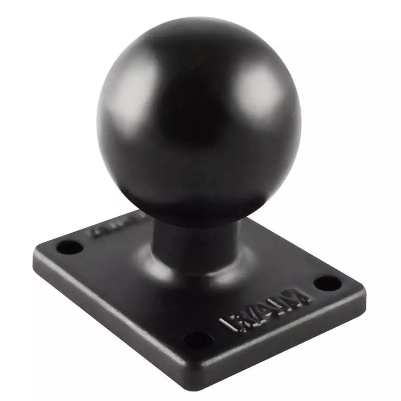 The RAM-347U consists of a 1.5 INCHES diameter rubber ball connected at right angles to a 2 INCHES x 1.7 INCHES rectangle base. The base has four pre-drilled holes at each corner, making the universal AMPS hole pattern.hole pattern 4-Hole AMPS: 1.181 INCHES x 1.496 INCHES plate size 1.69 INCHES x 2 INCHES ball size C Size (1.5 INCHES )weight capacity Standard Use: 4 lbsHeavy-Duty Use: 3 lbsmaterials Marine-grade aluminumpackaging type Poly BagWeight 0.2 lb