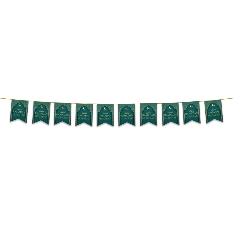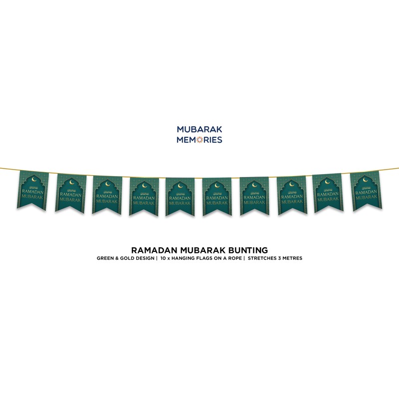 Ramadan Mubarak Bunting Decorations (Green & Gold Design) - Ramadhan Kareem Banner Flags Hanging Decor for Home Domes Lanterns Moon Star