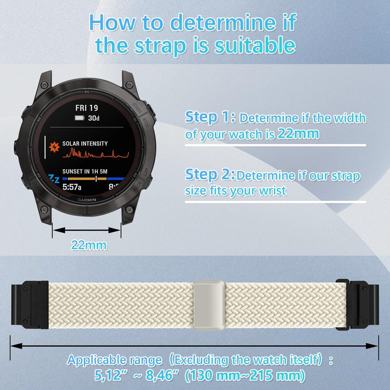 - Compatible models: QuickFit 22 mm nylon strap for Garmin Tactix 8 47 mm/Descent G2/fēnix 8 Sapphire AMOLED 47 mm/Fenix 8 Sapphire Dual Power 47 mm/Fenix E 47 mm/Fenix 7/Fenix 7 Pro/Fenix 6/Fenix 6 Pro/Fenix 6 GPS/Fenix 6 Pro GPS/Fenix 6 Pro GPS/Fenix 6 Sapphire/Fenix 6 Sapphire Solar/Fenix 5 Sapphire/Epix/Epix (Gen 2)/D2 Delta/Quatix 7 Sapphire Edition/Quatix 7 Standard Edition/Quatix 6/Quatix 6 Titanium/Approach S62/S60/MARQ Athlete/Captain/Driver/Expeditio/Aviator/Golfer (Gen 2)/Descent G1 x Solar