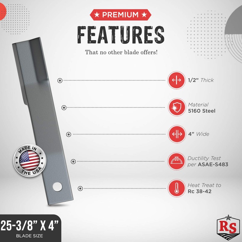- Dimensions: This rotary blade is 4 in. x 25-3/8 in. x 1/2 in. with a 1-1/2 in. bolt hole. The width at edge, the widest point, is 4-1/4 in.
