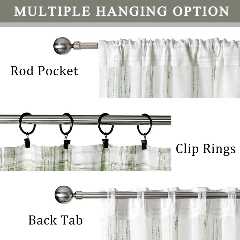 - Multiple Hanging Design: Can be styled in 3 ways: Slide rod through back loop for a backtab look, slide rod through pocket for a rod pocket look, hang with curtain rod in ring hook for a clip ring look. Fitting up to 1.5 inches curtain rods/poles.