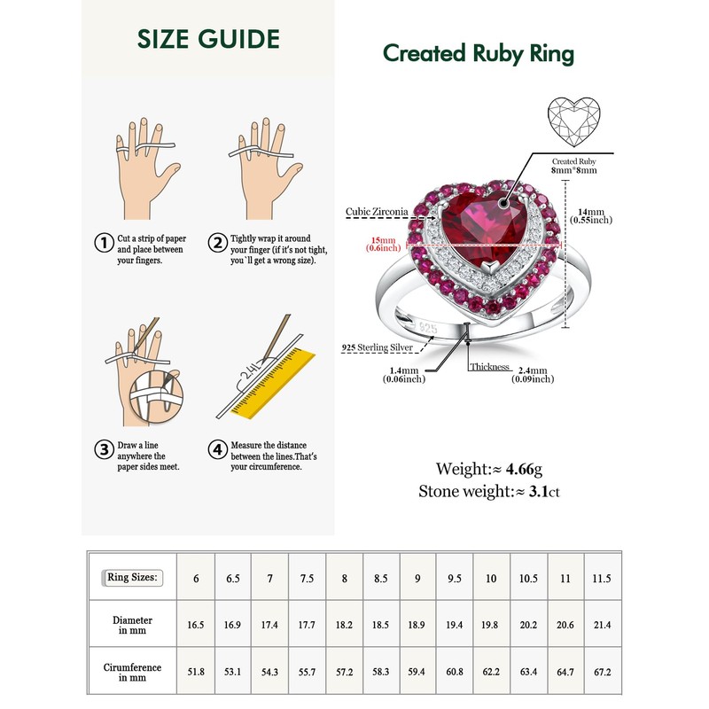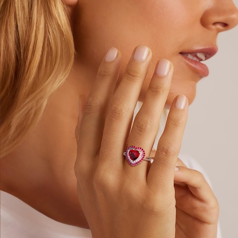 - Ruby Rings for Women: This ruby heart ring are 3-prong set with 8 mm heart shaped created ruby. Surrounded by a lap sparkling cubic zirconia and a lap small created ruby. The double halo setting enhances the size and brilliance of the main stone, making it a mesmerizing focal point