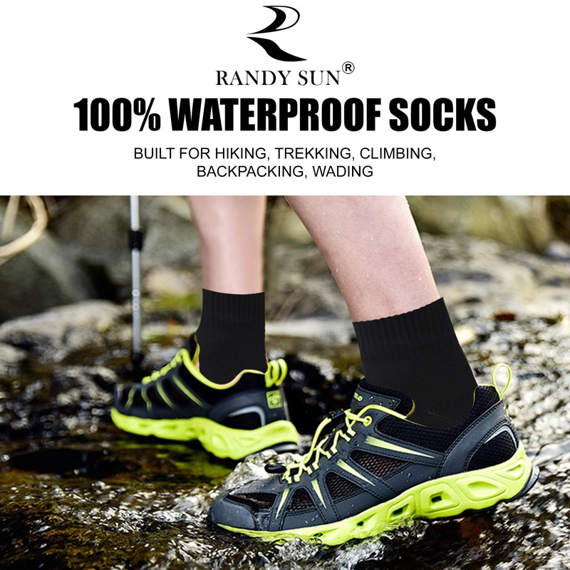 - WATERPROOF & BREATHABLE: 100% waterproof lightweight membrane doesn't let the external water molecules enter the socks. RANDY SUN waterproof socks are designed with breathable membrane and COOLMAX fabric to wick sweat away from your skin, thus keeping feet cool and dry during sports and exercise