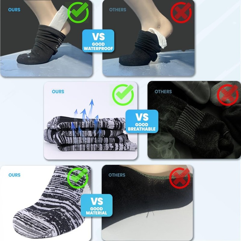 - 100% waterproof: Our socks have a three-layer structure and are incorporated with a lightweight waterproof and windproof film, creating a 100% waterproof effect. They are breathable, absorb moisture and sweat in warm weather, in extremely cold weather, they are comfortable and warm, keep your feet dry at all times.