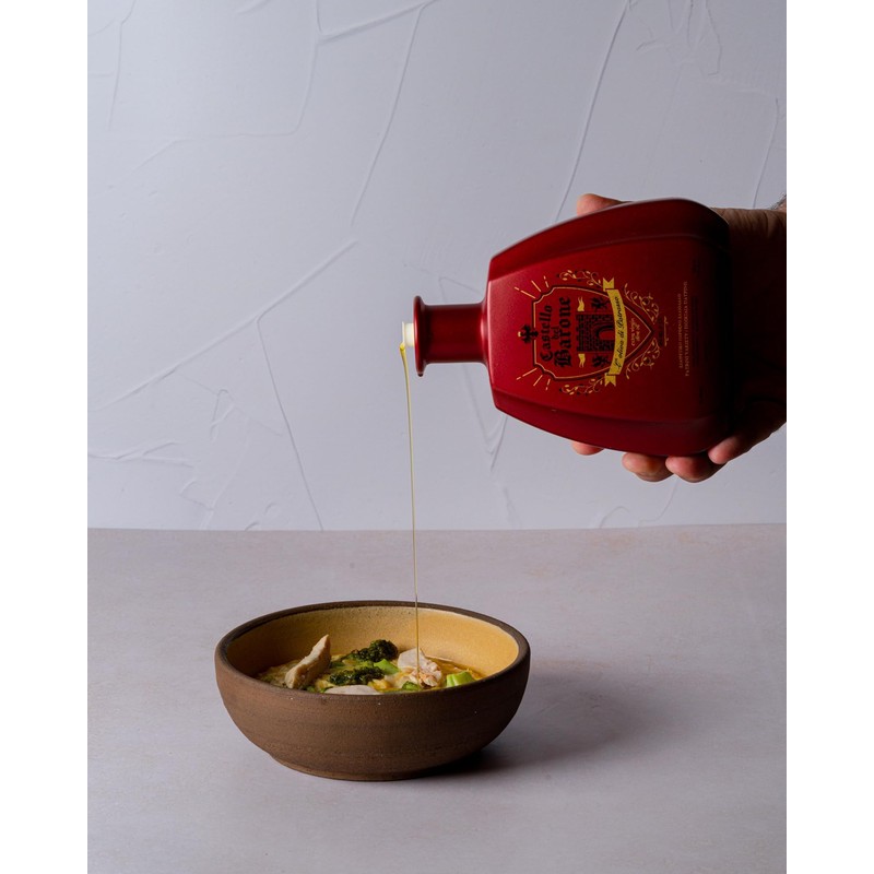 - The oldest trees surrounding the Baron's Castle are selected which, in combination with our own olive tree fields, offer us this extra virgin olive oil with a history of 8 centuries enclosed in a crimson bottle.