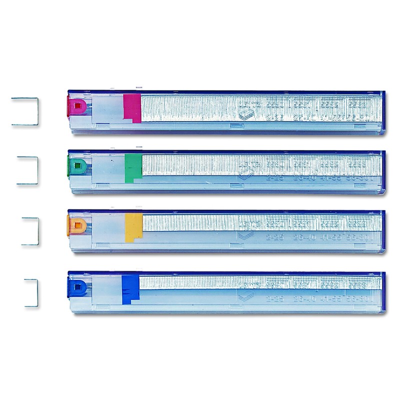 Colored coded staple cartridges; part of Rapid’s Heavy Duty Cartridge Stapler (item number: 02892). Each color represents a specific number of sheets that can be stapled. Cartridges easily load from the front and release with the push of a button. Five (5) fullstrip cartridges are included in each product box.