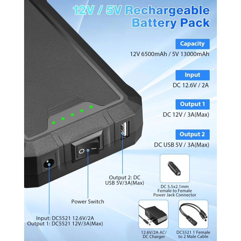 Rapthor 12V Battery Pack(DC5521 Port): Rechargeable DC 12V and USB 5V double output battery pack. The high capacity 12V 6500mAh / 5V 13000mAh supply longer working time to your devices.