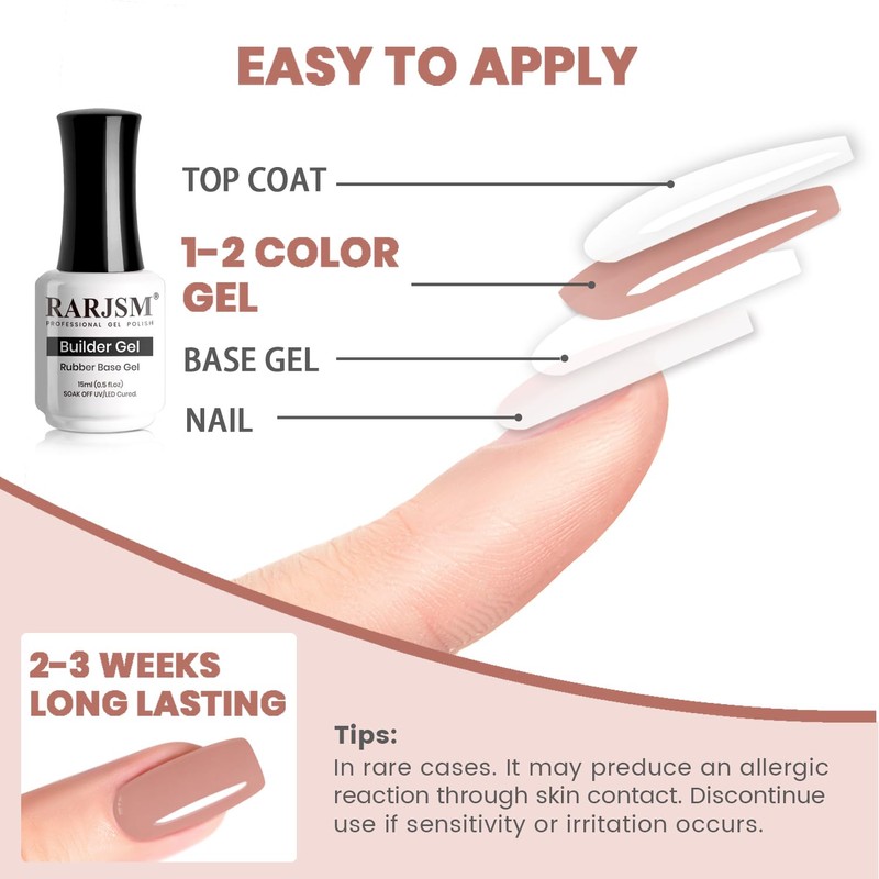 - MULTIFUNCTIONAL RUBBER BASE COAT:RARJSM rubber base gel nail polish is a nude skin tone gel and it is tend to be thicker than a regular base coat.Rubber base gel can be used as base coat,quick extension gel,sheer pink color gel and nail strengther gel. Rubber base gel also helps to make your nails more flexible if you have weak and brittle nails that might break or crack easily