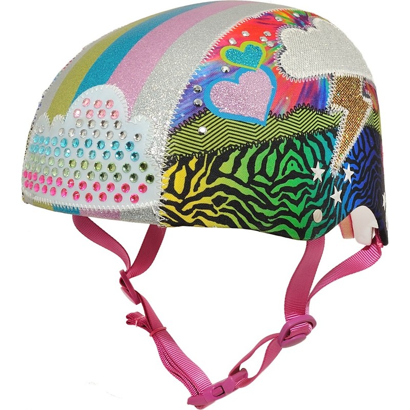 - DESIGN - You'll love the fabric covered helmet with applique studs, glitter and color matching straps! The helmet is B-dazzled w/over 60 sparkling gems and 6 motion activated LED lights. Auto shut off to prolong battery life