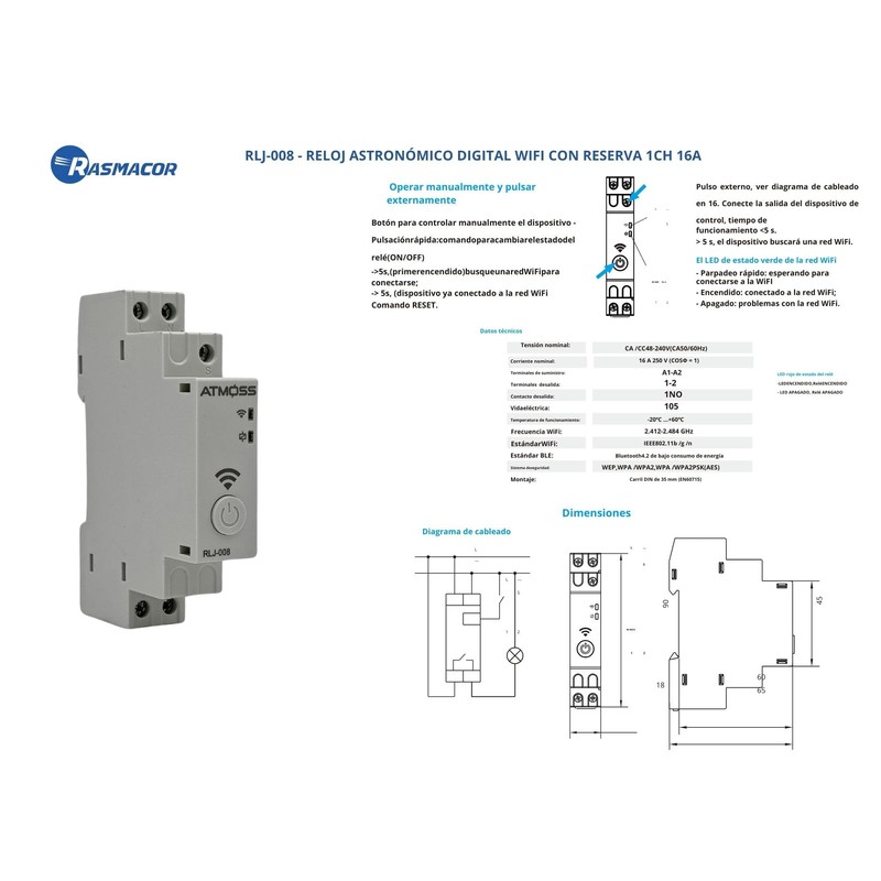 RASMACOR RLJ-008 1 Channel 16A AC/DC 48-240V AC 50/60Hz Digital Astronomical Timer Switch 1 Module Dimensions 65 x 90 x 18mm