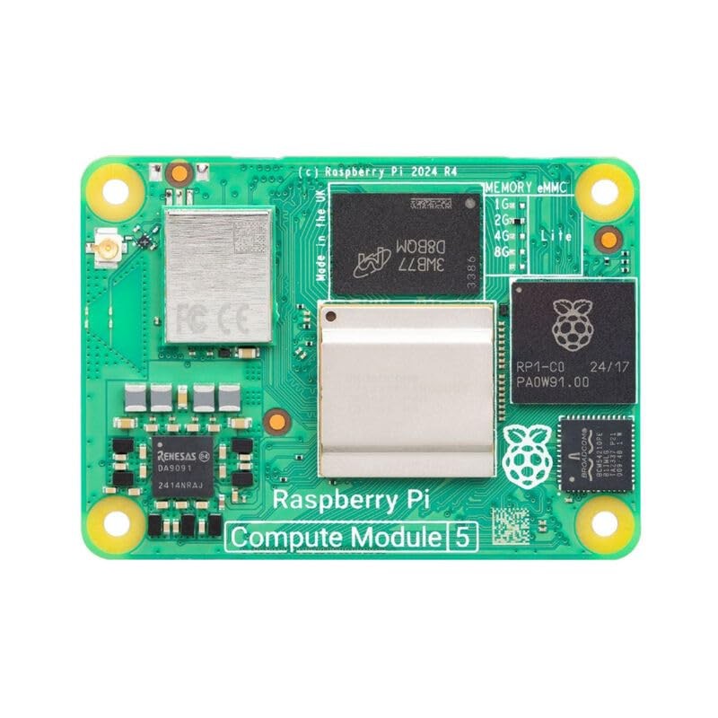 The Raspberry Pi Compute Module 5 represents the latest evolution in compact computing technology. This powerful single-board computer features a robust 2.4GHz quad-core ARM Cortex-A76 processor paired with 4GB of RAM, providing impressive performance for embedded applications. Measuring just 5.5 x 4 cm, this compact module offers extensive connectivity options including GPIO, I2C, SPI, PCIe and UART interfaces. The CM5 supports both eMMC and SDIO memory interfaces while providing comprehensive display capabilities through HDMI, MIPI CSI, and MIPI-DSI outputs with OpenGL support. Network connectivity is ensured with built-in Wi-Fi/Bluetooth features and a 1Gbps Ethernet port. The module includes one USB 2.0 and two USB 3.0 ports for peripheral connections. Built to work in demanding conditions, it operates in an impressive temperature range from -20°C to 85°C. This versatile compute module provides the ideal foundation for industrial applications, embedded systems and custom hardware solutions where compact size and processing power are essential.