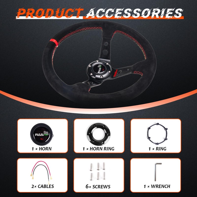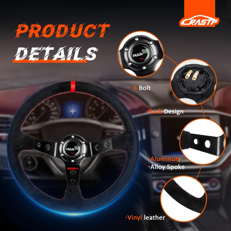 RASTP Universal Racing Steering Wheel Suede Deep Dish 13.58”/345mm 6 Bolts with Horn Button Include Cable, Wrench,Red | RASTP