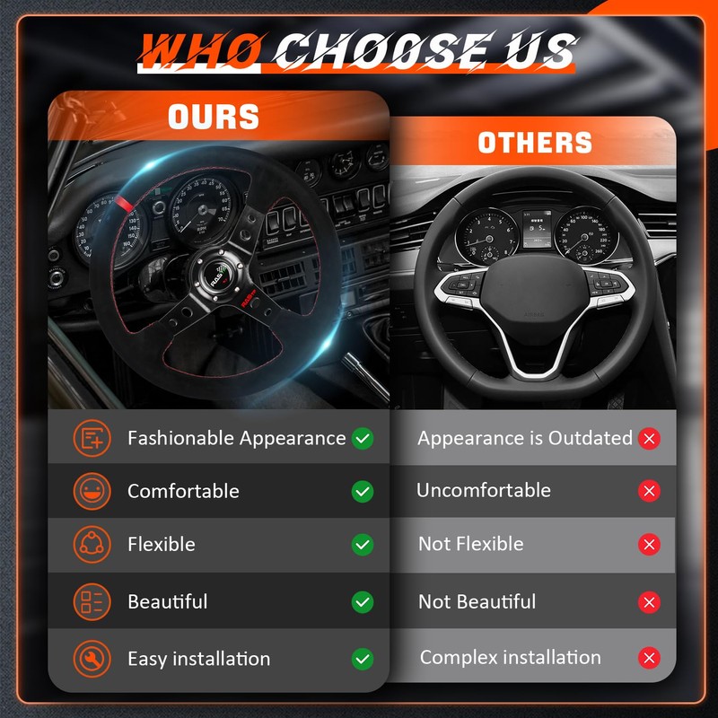 - Comfortable and Durable - Aluminum steering wheel frame and wrapped with Suede, comfortable and durable