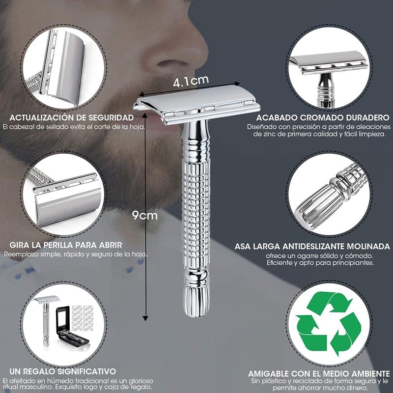 - El diseño clásico de maquinilla de afeitar de seguridad de doble filo es duradero, fácil de limpiar y fácil de usar.