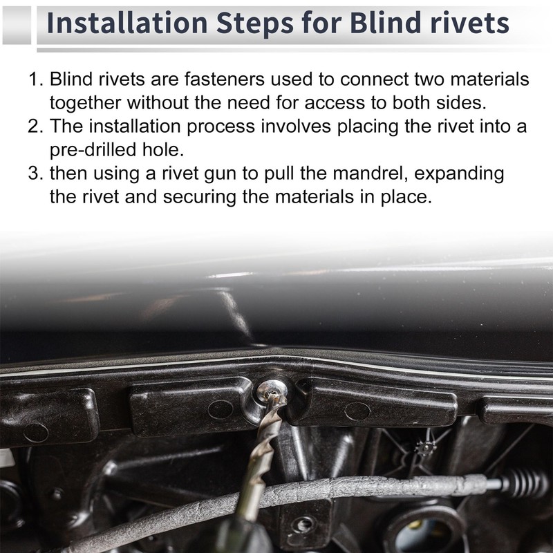 - Installation Steps:Installation Steps for Blind rivets:1. Blind rivets are fasteners used to connect two materials together without the need for access to both sides. 2. The installation process involves placing the rivet into a pre-drilled hole, 3. then using a rivet gun to pull the mandrel, expanding the rivet and securing the materials in place.