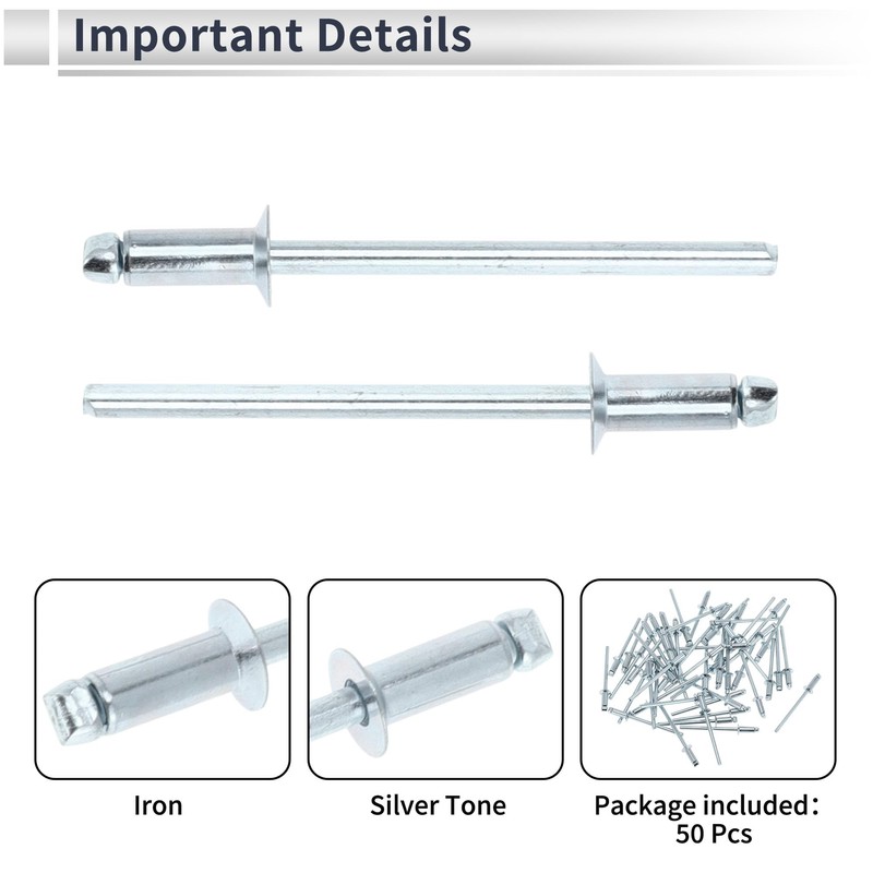 • Functionality:Product Name: Open End Large Flange Blind Rivets; Material: Iron; Color: Silver Tone